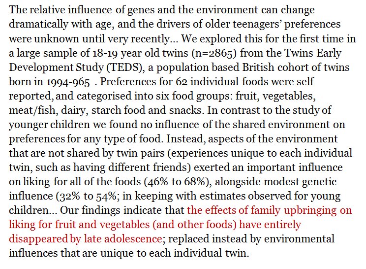 From adolescence onwards, classical environmental factors cease to have any impact on people's food likes % dislikes https://www.researchgate.net/profile/Andrea_Smith22/publication/317889245_Genetic_and_environmental_influences_on_fruit_and_vegetable_liking_in_adolescence/links/5950e0fdaca27248ae461376/Genetic-and-environmental-influences-on-fruit-and-vegetable-liking-in-adolescence.pdf …pic.twitter.com/vPXdNPssbr
