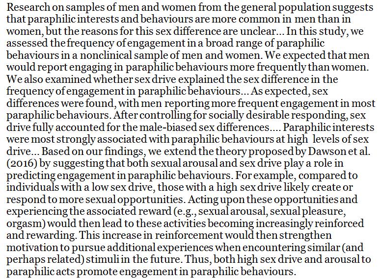 Paraphilias are an outgrowth of a more intensive sex drive, which, in turn, is indicated by the presence of paraphilias. Circular.