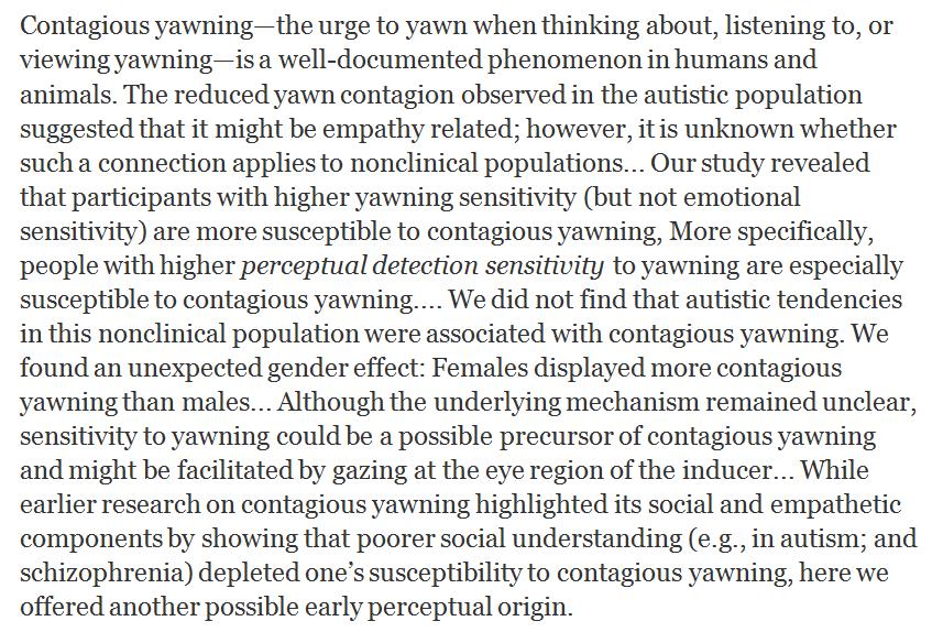 Autistic traits don't lower the susceptibility to contagious yawning, but a keen sense for the yawn face enhances it http://journals.sagepub.com/doi/full/10.1177/2041669517726797 …pic.twitter.com/831fG79gI3