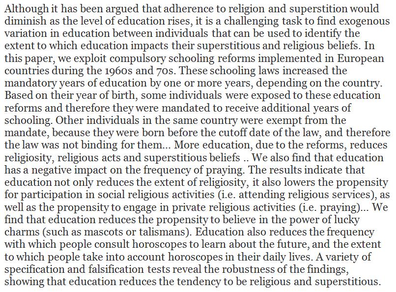 An increase in formal education diminishes religious and superstitious beliefs. http://www.sciencedirect.com/science/article/pii/S016726811730183X …pic.twitter.com/Pl7nzEvscO