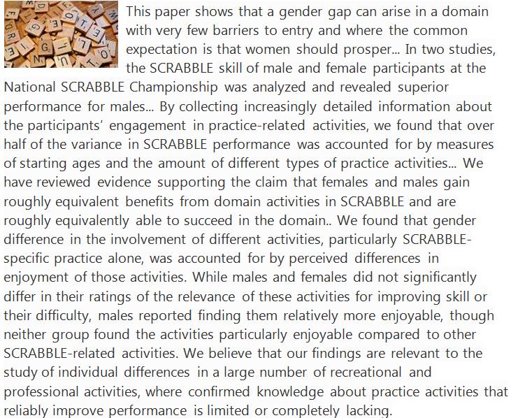 Males are better at SCRABBLE championship, due to greater enjoyment and higher engagement in purposeful practice. https://link.springer.com/article/10.1007/s00426-017-0905-3 …pic.twitter.com/fCnMyldVDC