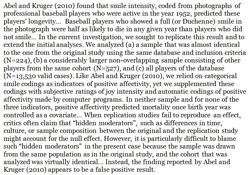 Widely cited finding that athletes' smile predicted longevity decades later fails to replicate. http://home.uni-leipzig.de/diffdiag/pppd/wp-content/uploads/Dufner%20et%20al.%202017%20Psych%20Science%20Pre-Print.pdf … h/t @maltoesermaltepic.twitter.com/kX6bfoc33H