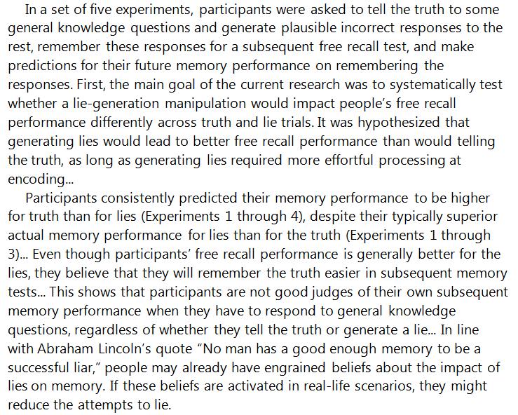 Perhaps lying is not just a matter of memory. There are many kinds of lying, and some tax executive function, when truth works automatically