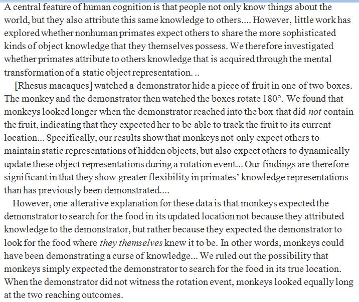 Crazy theory: maybe monkeys demonstrate some primitive sort of "theory" of mind.