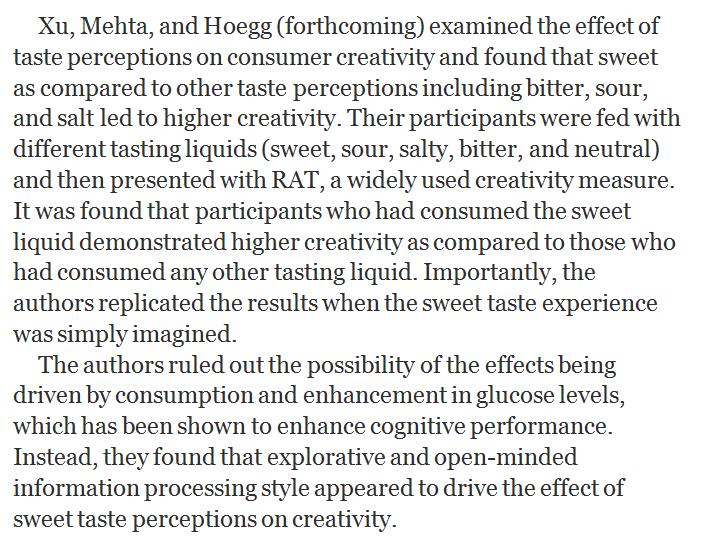 More silly priming stuff: Tasting sweet enhances creativity. http://www.journals.uchicago.edu/doi/abs/10.1086/693161 …pic.twitter.com/NjRBJ9Vr2l