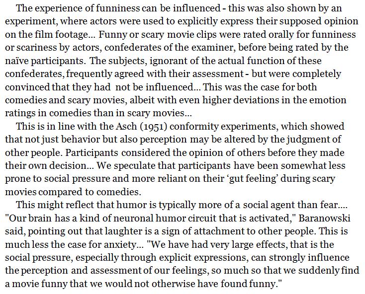 The judgment of funniness of movies was far more strongly influenced by conformity pressure than that of scariness. http://www.uni-mainz.de/presse/aktuell/2506_DEU_HTML.php …pic.twitter.com/kYKUjhRtup
