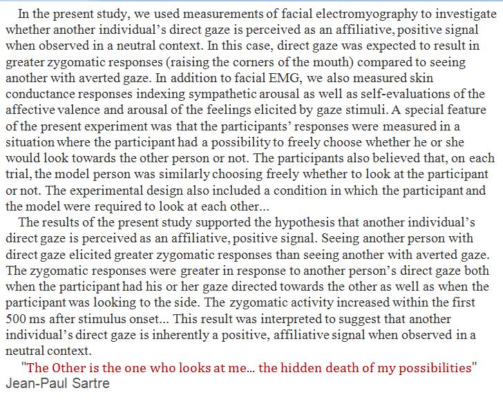 Ums mal mit Houellebecq zu sagen: Sartre litt an einer "an Behinderung grenzende Hässlichkeit". Daher wohl seine Abneigung gegen Blicke.