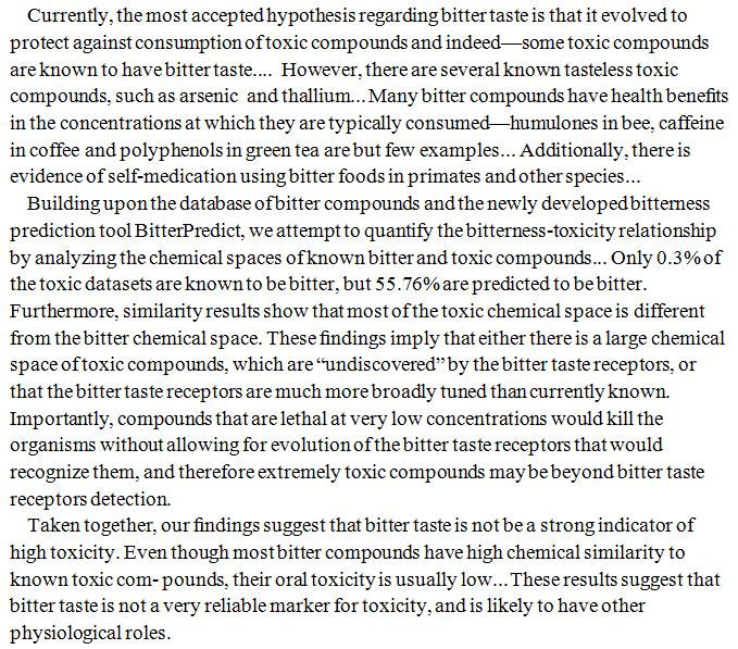Issue also is "bitter" is not monolothic. Tonnes of flavours that aren't sour, salty, sweet, savoury, but which taste "bitter" in high concentration (e.g. smokey, earthy, nutty). "Bitter" is basically the leftover taste category, suggesting the 5 category model of taste is wrong.