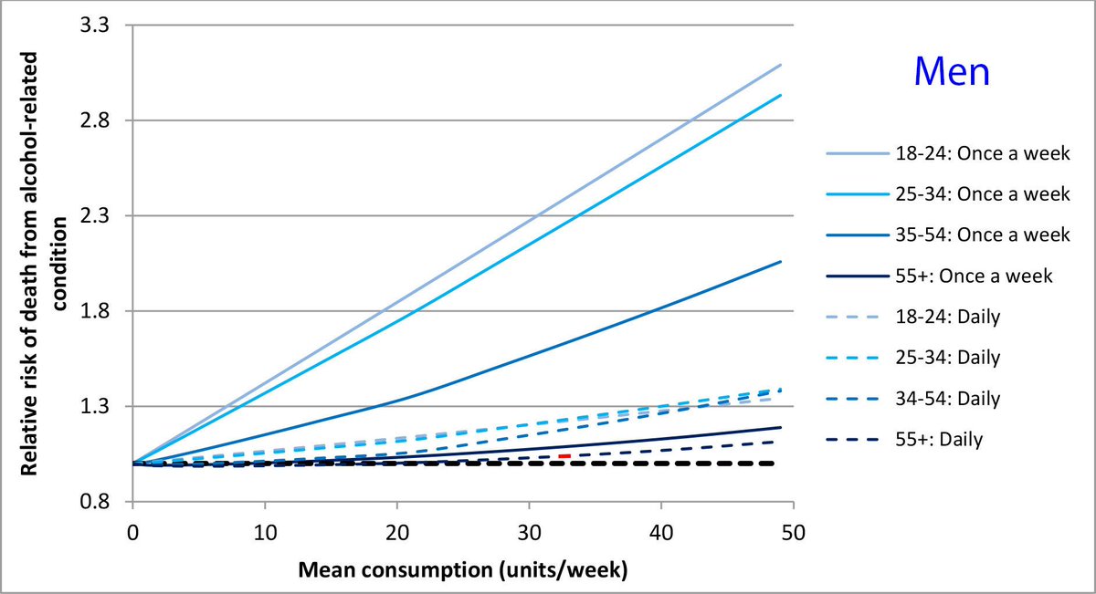 Alcohol has monotonic increasing risk for some (slow) disorders. (Cancers, liver). Moderate alcohol has protective effects for some (nearer) disorders. (CVD, strokes). Young people have time to be at risk of slow disorders. Older people need protection from nearer disorders.