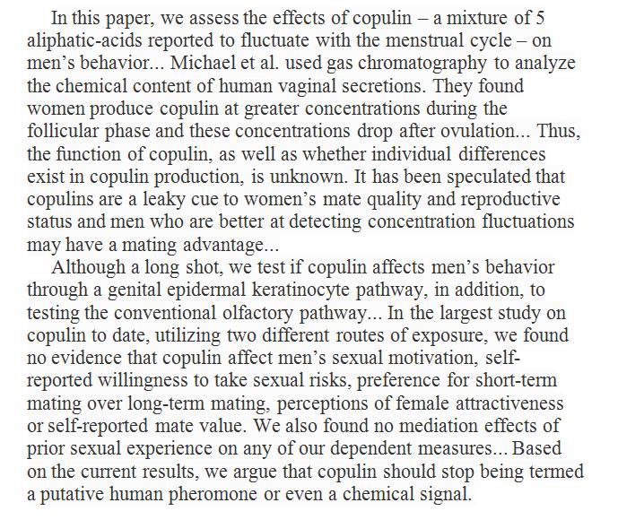 So-called copulins, putative female pheromones emitted from the vagina and supposed to make men drool, don't pass the scientific smell test. https://link.springer.com/article/10.1007/s40750-017-0083-y …pic.twitter.com/gzlRgN0BFY