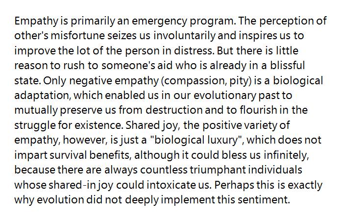 By the way, "positive empathy", in the affectionate category, is one of the most precious emotions, as it is so rare and hardly embedded in our nature, https://plus.google.com/101046916407340625977/posts/6uLTcytdvse …pic.twitter.com/AJjo04Uudn