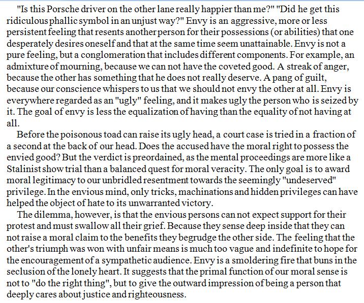 The greatest evil about envy is that it morally condemns the target (without evidence), for NOT DESERVING their advantages.https://twitter.com/DegenRolf/status/941584443441074176 …