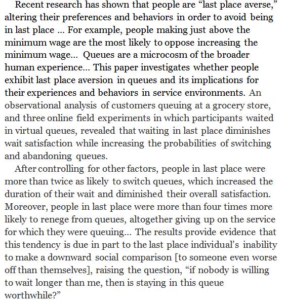 The devil takes the hindmost: People at the end of the queue were more than twice as likely to switch queues, increasing waiting time and diminishing satisfaction. https://ideas.repec.org/p/hbs/wpaper/18-053.html …pic.twitter.com/xICvPQZTYN