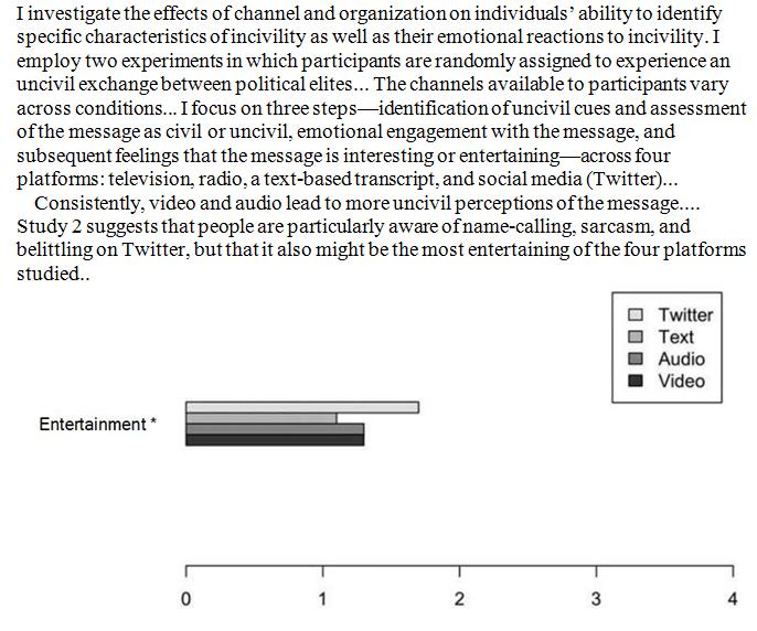 Incivil political exchanges were perceived as more entertaining on Twitter than on other media platforms. http://www.tandfonline.com/doi/full/10.1080/10584609.2017.1355857 …pic.twitter.com/eZ9WFPc0ht