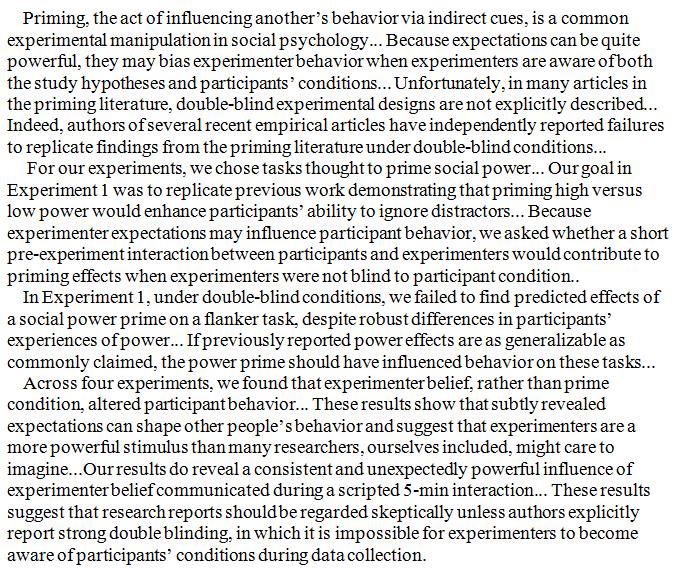 The effects of social priming, the voodoo theory of social psychology, manifested themselves only when the experiments weren't double blinded, exposing a self-fulfilling prophecy. http://journals.sagepub.com/doi/full/10.1177/0956797617737128 …pic.twitter.com/zJGdfj9pfL