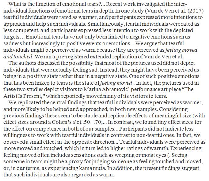 Individuals with tearful eyes were judged to be warmer, not because they were perceived as sad, but because they were perceived as moved and touched. http://www.tandfonline.com/doi/full/10.1080/02699931.2018.1430556 …pic.twitter.com/Jq5xSvKjsY