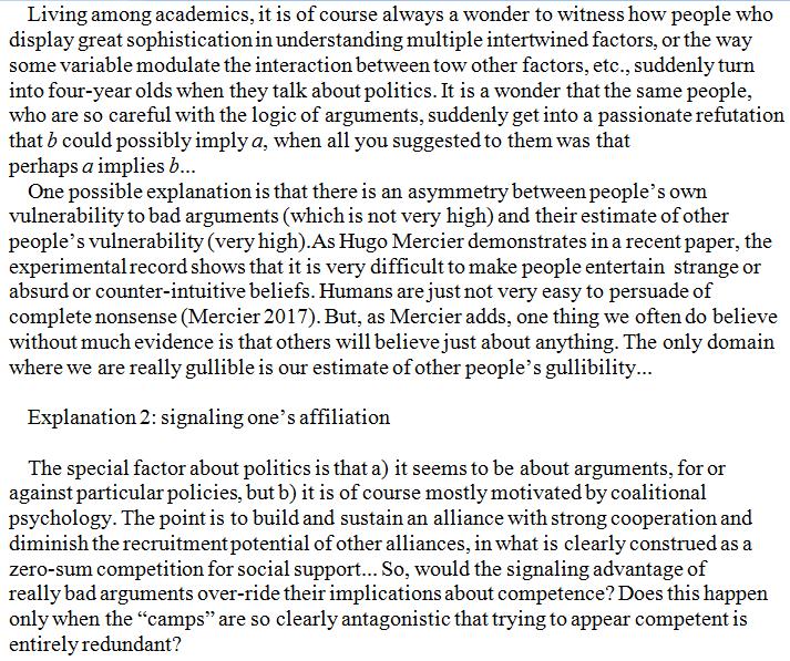 Great essay by Pascal Boyer on how smart people make stupid arguments the moment that politics creep into their thoughts. http://cognitionandculture.net/blog/pascals-blog/so-youre-saying-we-should-live-like-lobsters-or-why-does-politics-make-us-stupid …pic.twitter.com/QY0vY1EgsW