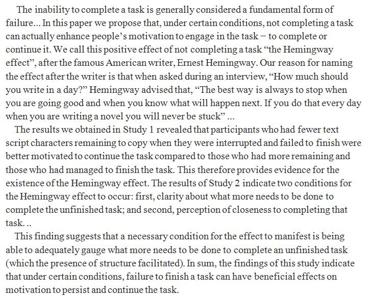 The Hemingway effect: Failing to finish a task can actually enhance people’s motivation to bring it to a close. https://www.sciencedirect.com/science/article/pii/S187118711730189X …pic.twitter.com/Y7fnTPhwXR