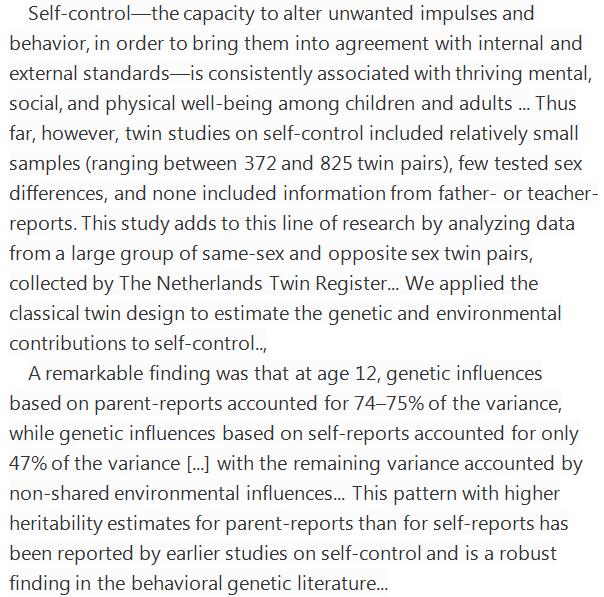 the premise (the environments of MZs are no more similar than those of DZs) is false so the conclusion (individual differences in self-control are genetically determined) is false