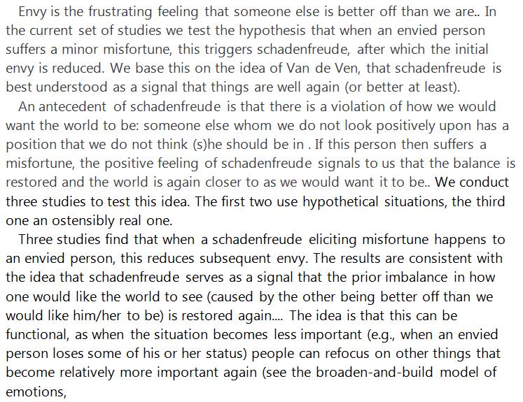 Schadenfreude turns the scales of justice for a short precious moment in our favor - and thus alleviates envy. https://osf.io/hny3r/  Background: Schadenfreude - The joy in others' misfortune https://plus.google.com/101046916407340625977/posts/YRVfS8runXR …pic.twitter.com/hsAWOirjMO