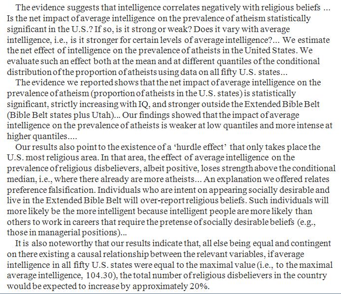 Intelligence correlates negatively with religious beliefs, though less strongly in the Bible Belt. https://www.sciencedirect.com/science/article/pii/S0160289617301848 …pic.twitter.com/FMf71CyjUs