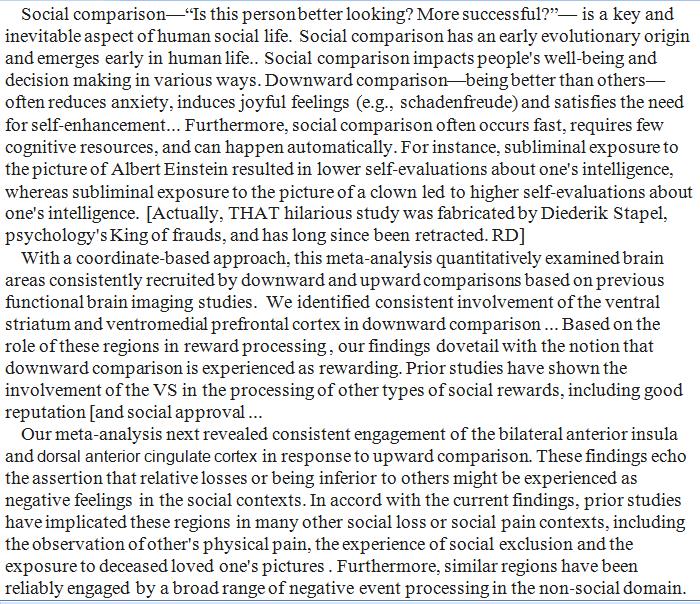 The joy when others are even worse off than ourselves: Downward social comparison engages the reward system of the brain, while upward comparison pushes the displeasure buttons. https://onlinelibrary.wiley.com/doi/full/10.1002/hbm.23854 …pic.twitter.com/E2wDuE0s2E
