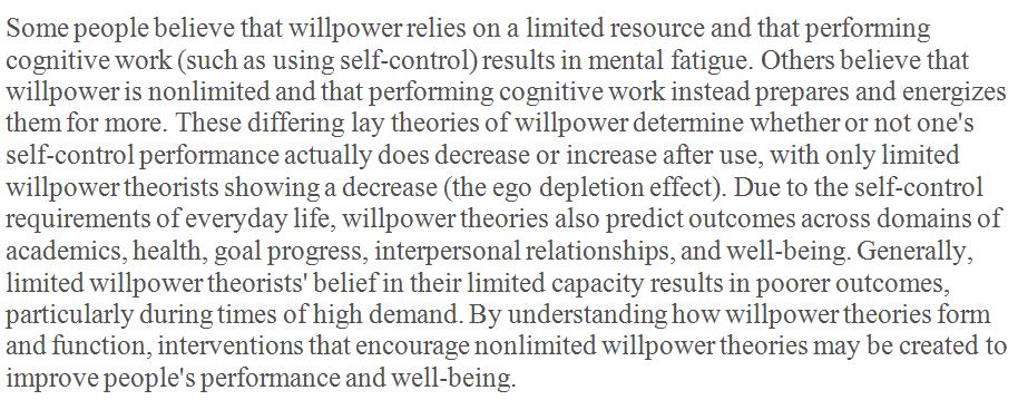 Belief in willpower as a limited resource (Roy Baumeister's "ego depletion") is counterproductive, leading to inferior career, health and happiness outcomes. https://onlinelibrary.wiley.com/doi/full/10.1111/spc3.12381 …pic.twitter.com/3XnTIpfMUy