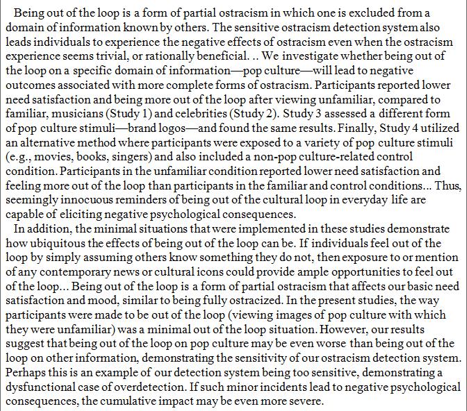 Being out of the loop on pop culture can hurt like being ostracised from one's group. http://psycnet.apa.org/record/2016-32098-001 …pic.twitter.com/rVh47su7gt