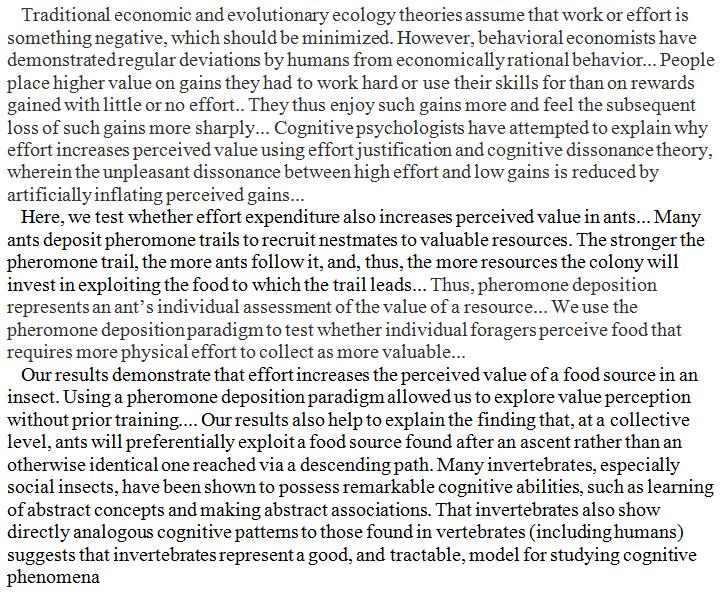 People value things and outcomes more highly if they had to exert more effort achieving them ("effort justification"). Ants do to. http://psycnet.apa.org/record/2018-08983-001?doi=1 … h/t @Neuro_Skepticpic.twitter.com/2EI242QC3O