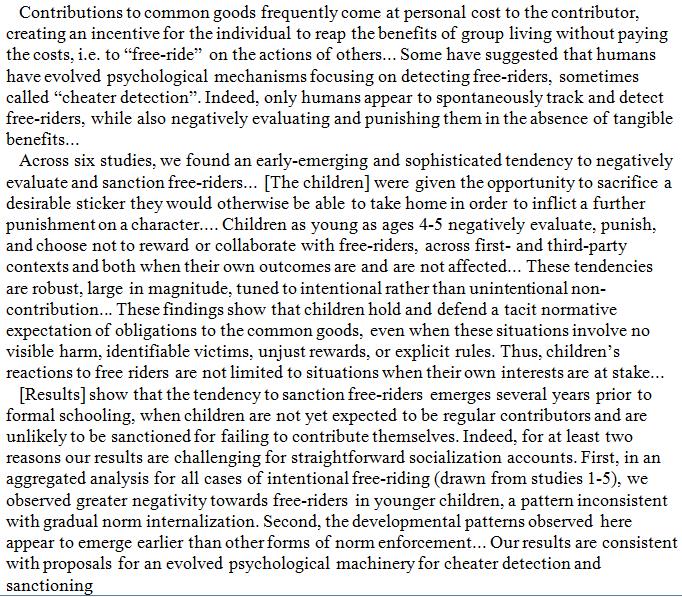 Already at age 4, children express a strong and probably innate tendency to negatively evaluate and punish free-riders, at a personal cost. https://psyarxiv.com/xmqk8/ pic.twitter.com/2VzBHhlt1H