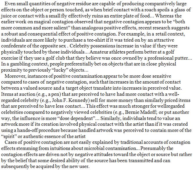 Positive magical contagion: Things can increase in value if they had been in contact with an esteemed target - such as a sweater that had been tried on by an attractive person of the opposite sex. https://sites.lsa.umich.edu/esplab/wp-content/uploads/sites/168/2018/01/Huang_Magical-contagion2017.pdf …pic.twitter.com/imHLiFpGqN