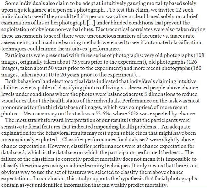 Some individuals could tell if a person was alive or dead based solely on a brief examination of his or her photograph, while machine learning failed at the job. The journal "Explore" has an affinity for the psychic. https://www.sciencedirect.com/science/article/pii/S1550830717303397?dgcid=raven_sd_aip_email …pic.twitter.com/HpzxLBqhaZ