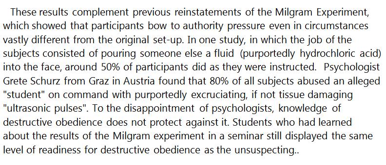 One of the replications was in response to claims that subjects must be seeing through the ruse. So a live puppy was used. Turns out ordinary people will torture a puppy on command.