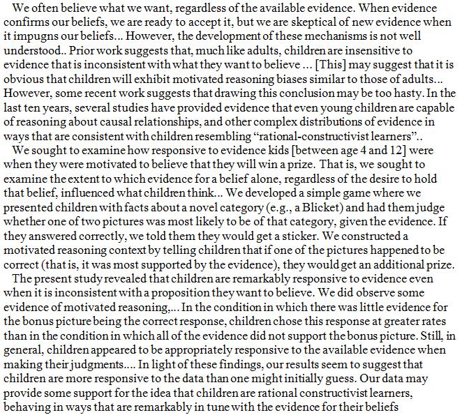 Children are remarkably immune to motivated reasoning, the propensity to only look for evidence that supports one's wishes and preconceived convictions. Preregistered study. https://static1.squarespace.com/static/59f0a43dbce176d4b82fee86/t/5a7880cd0d929789ff4a0d71/1517846733722/Evidence+Assimilation+CogSci2018.pdf …pic.twitter.com/SZjL4juaic
