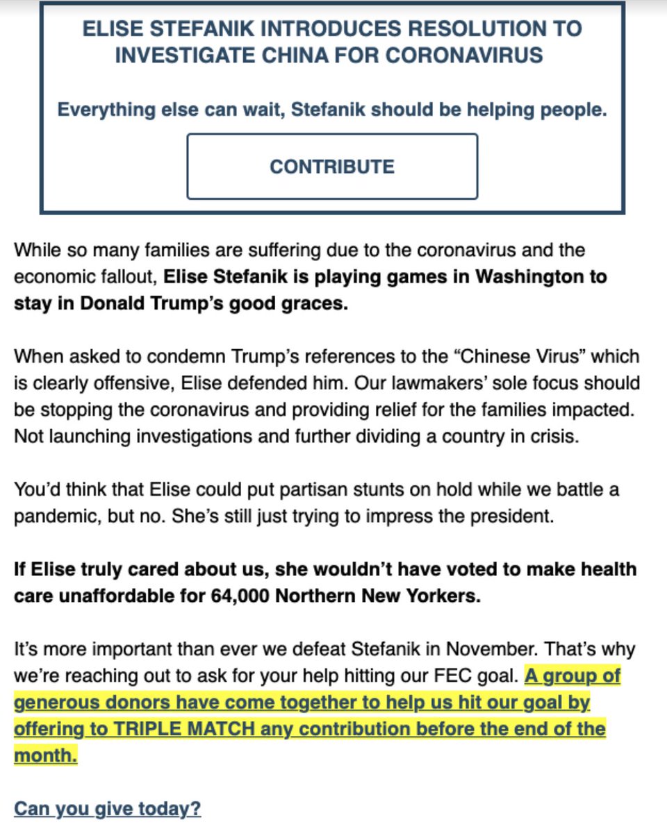 ❌ Saying "You’d think that Elise could put partisan stunts on hold while we battle a pandemic, but no. She’s still just trying to impress the president." ?? ❌ Ran negative ads calling @EliseStefanik "The future of the GOP" 🤔🙃