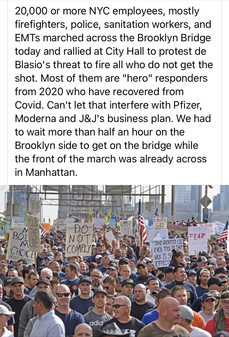 NYC WORKERS ANTI-MANDATE MARCH FOR CHOICE New York City sanitation workers, firefighters, police officers, EMS personnel and correctional officers gather in protest of New York City’s COVID-19 vaccine mandate.https://twitter.com/i/broadcasts/1lDxLLZMZkMxm …
