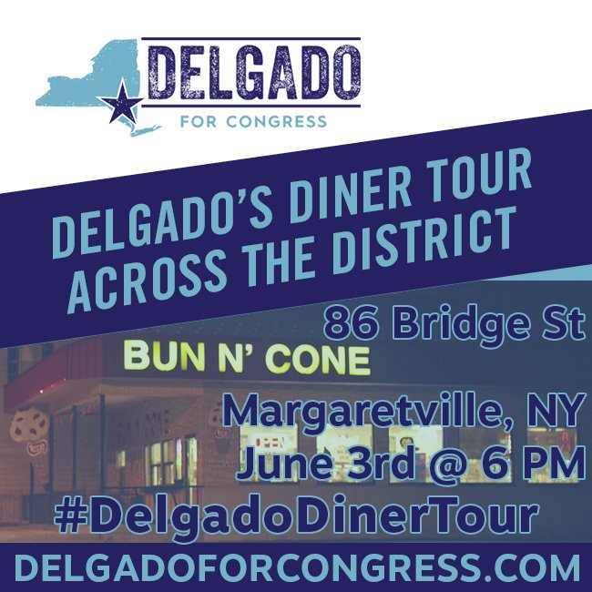 Our next #DelgadoDinerTour stop will be in Delaware County TOMORROW at the Bun N' Cone in Margaretville. I'm looking forward to speaking with you - see you at 6 PM! #NY19pic.twitter.com/jILRDJQSP5