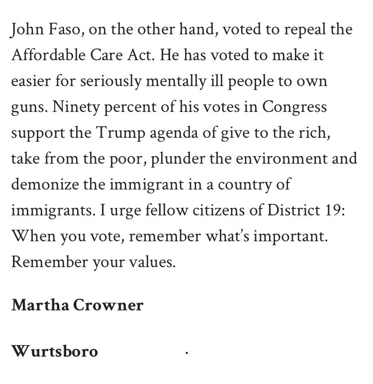 A letter published in @recordonline from a supporter in #Wurtsboro reminds us "When you vote, remember what’s important. Remember your values." #NY19