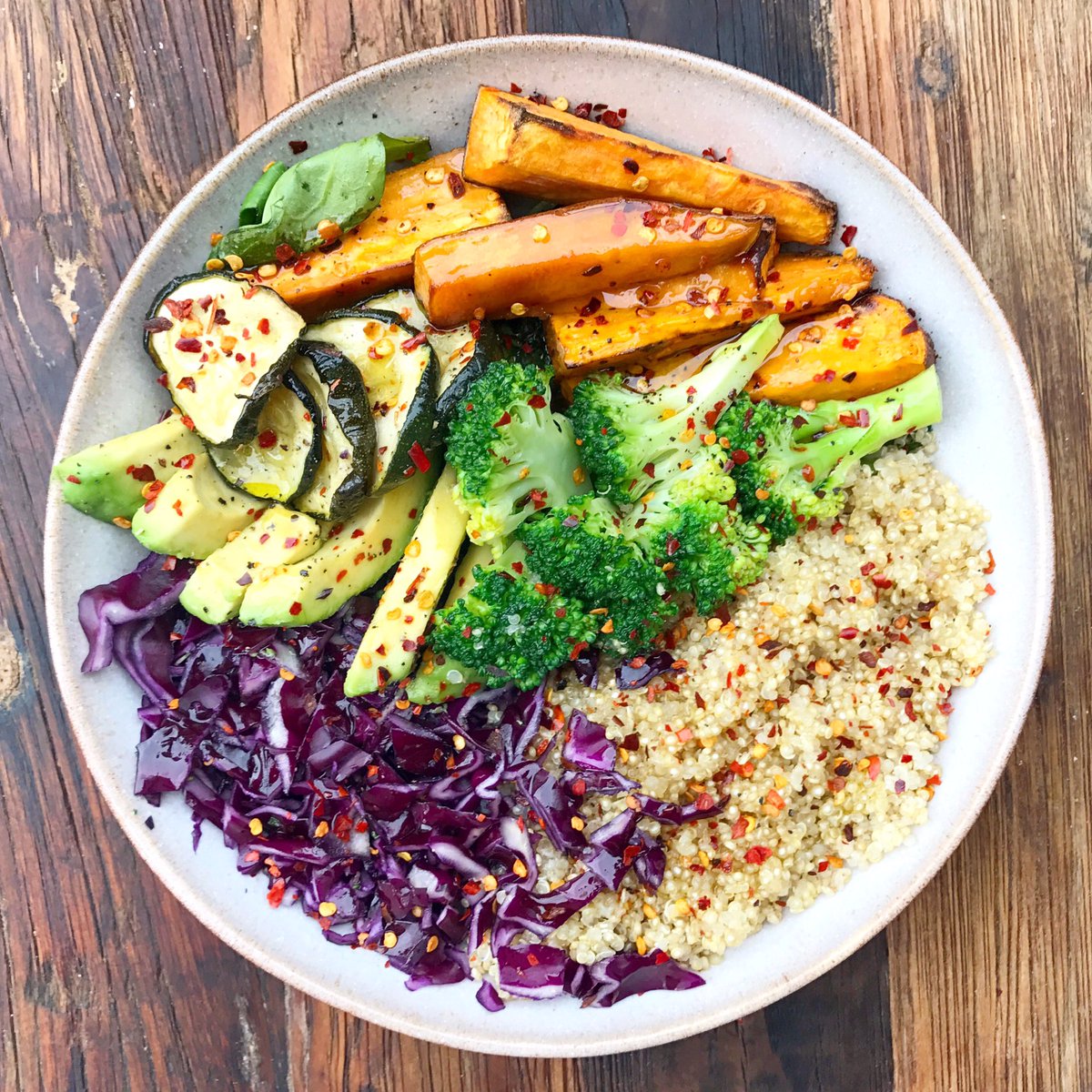 Leftovers for lunch - roasted sweet potatoes, broccoli, courgettes, cabbage & quinoa with avocado, chilli flakes, lemon juice & olive oilpic.twitter.com/K8UMFhB2qS