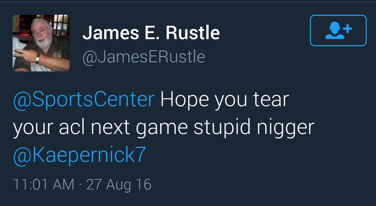 "Niggers" "retort" to violence says violent White Supremacist @JamesERustle who then wishes violence on #Kaepernick.pic.twitter.com/lnegsFDmrs