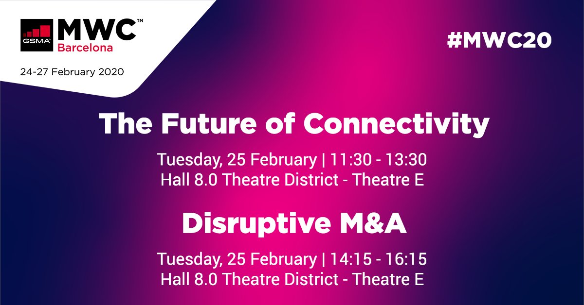 @Deloitte will be hosting two partners programmes. Find out more about each below: The Future of#Connectivity - http://bit.ly/36qdNWJ Disruptive M&A - http://bit.ly/2Rsaj1L#MWC20pic.twitter.com/vzYNA06ehn