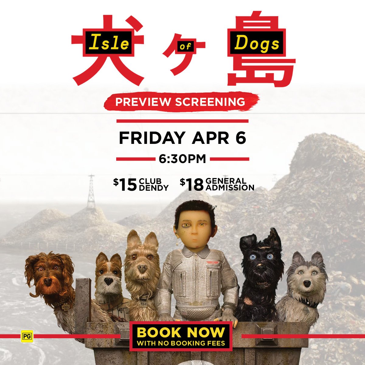 #IsleOfDogs, at#DendyNewtown! Haven't booked your tickets yet for the preview screening tomorrow, 6:30pm? Here's your last chance: https://bit.ly/2pEiQAx pic.twitter.com/9dZ1578PwO