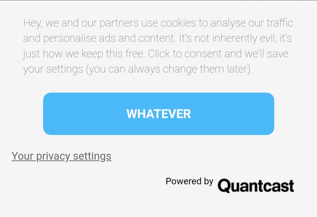 @quantcast for the most refreshingly honest cookies banner I've ever seenpic.twitter.com/xJW8aTkSrG