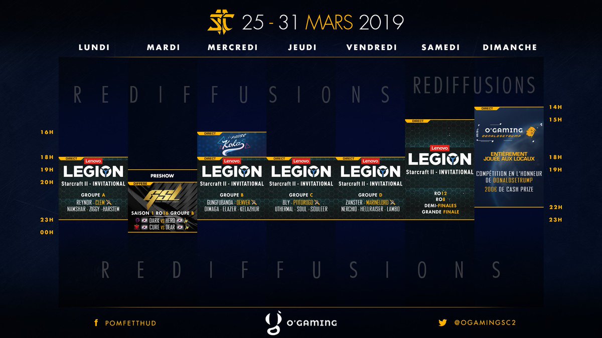 Cette semaine c'est la #TakeLegion qui est à l'honneur ! @Clem_sc2 s'est qualifié hier, @Denver_sc2 @PtitDrogo & @MarineLorDSC2 jouent les 3 prochains jours. En attendant on finit le RO16 #GSL, et on terminera la semaine par la #OGDonaldSeTrump ! 📺 http://twitch.tv/ogamingsc2  #OGSC2pic.twitter.com/dYYaIrt8Uc