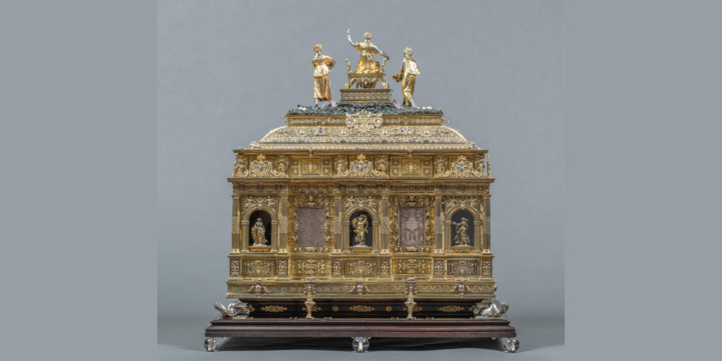 Esta pieza construida en Núremberg por Wenzel Jamnitzer, el platero más importante de Alemania, llegó a Madrid traída por Ana de Austria (hija del emperador Maximiliano II y María de Austria) con motivo de la celebración de su boda en Segovia con Felipe II