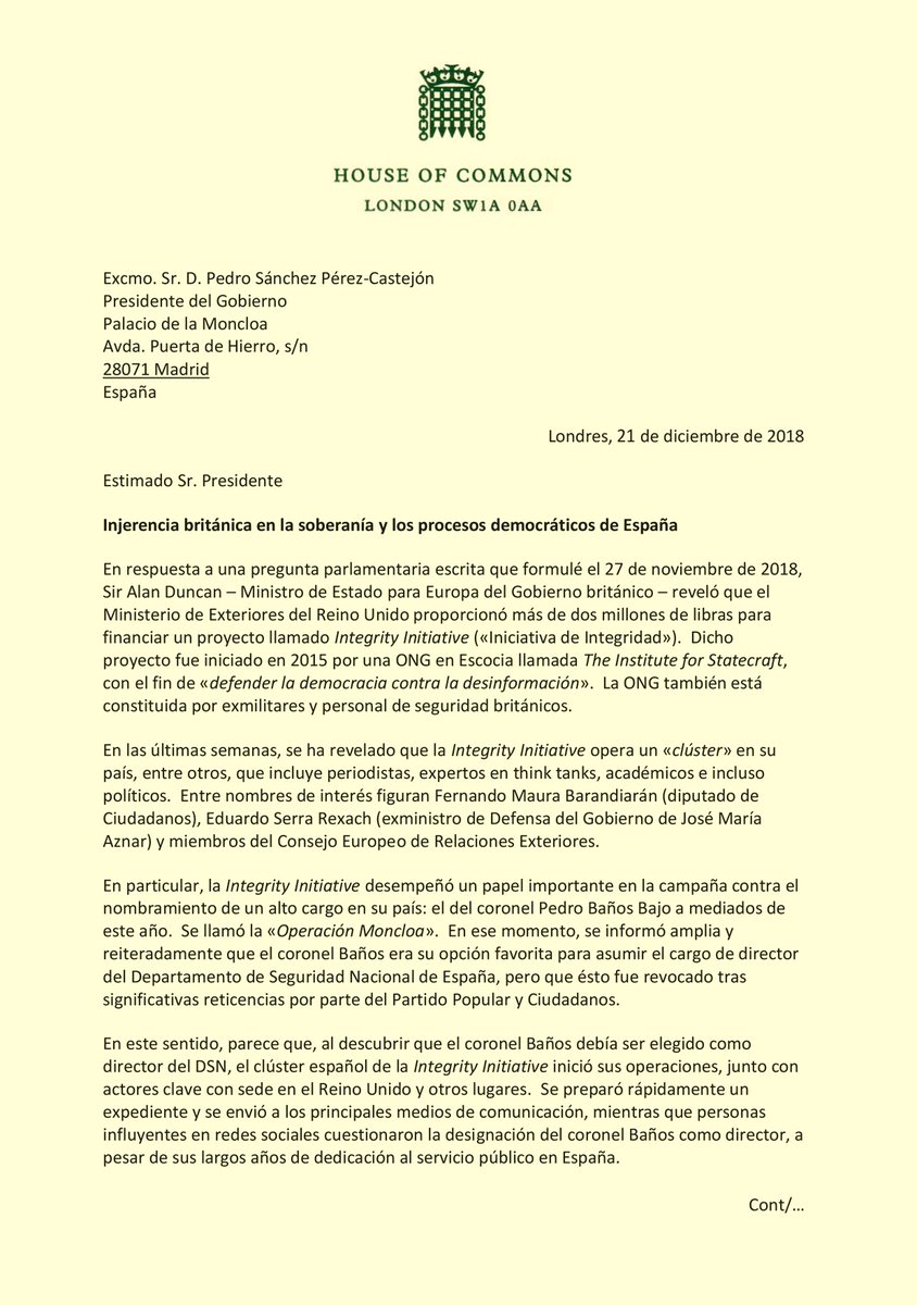 @sanchezcastejon about the campaign launched by@initintegrity this summer against the appointment of Pedro Baños as Spain’s Director of National Security. Spain is a valued ally and friend. What happened is scandalous and it must be fully investigated.pic.twitter.com/sSLzFqsaJP