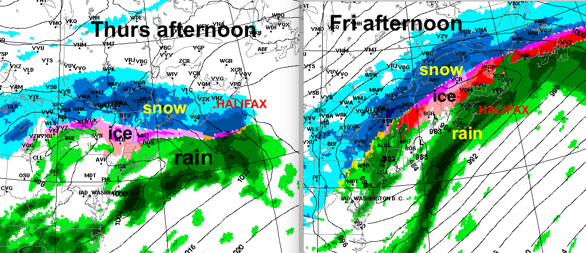 Enjoy a couple of quiet weather days before travel is impacted by of mixed precipitation. Snow develops Thurs then changes to an icy mix and finally to rain in the S Maritimes. Heaviest snow over N NB with extended freezing rain/ice pellets further S. System persists Fri night.pic.twitter.com/LyzMd15prA