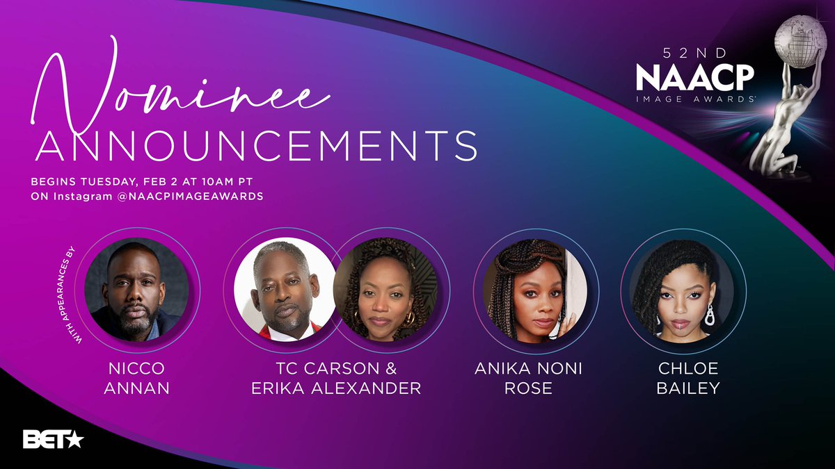 #BreakingNews: Nominees for the 52nd#NAACPImageAwards will be announced on Tuesday, Feb. 2 beginning at 10AM PT on the @NAACPImageAwards Instagram. Be sure to follow http://Instagram.com/NAACPImageAwards … now!pic.twitter.com/wA2vuwOTln