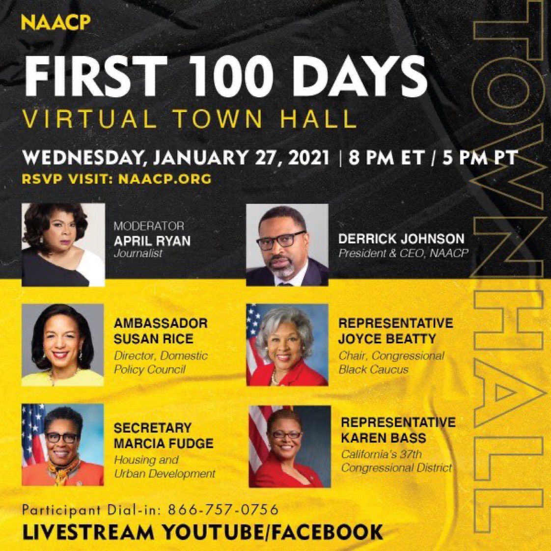 Tell a friend to tell a friend that the First 100 Days Virtual Town Hall starts NOW! Watch LIVE at http://YouTube.com/naacp Moderated By: