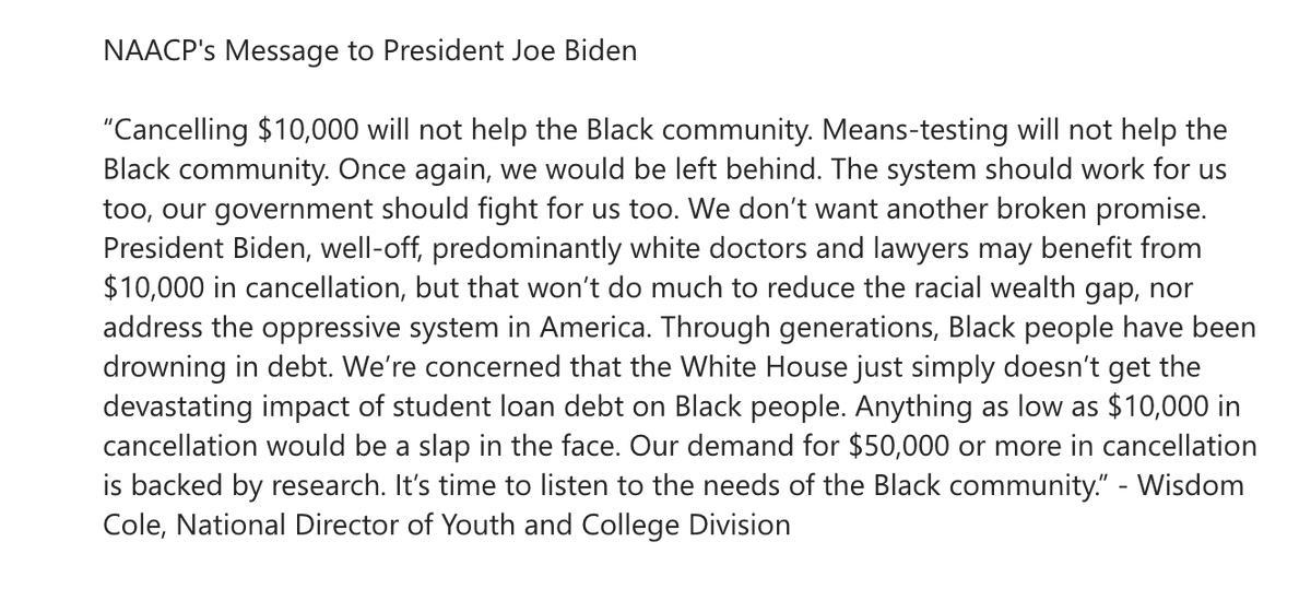 NAACP slams Pres. Biden for saying he will not cancel 50k in federal student loan debt "President Biden, we agree that we shouldn’t cancel $50,000 in student loan debt. We should cancel all of it. $50,000 was just the bottom line.”